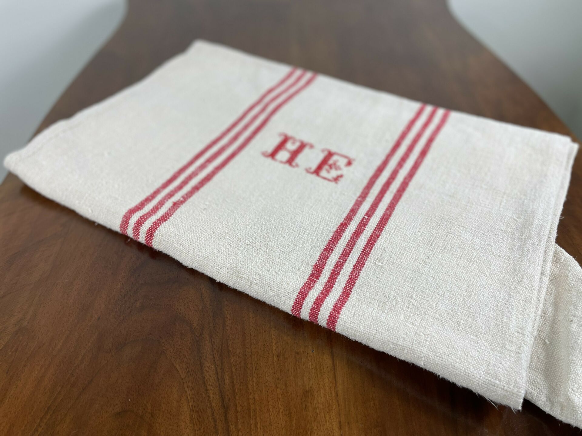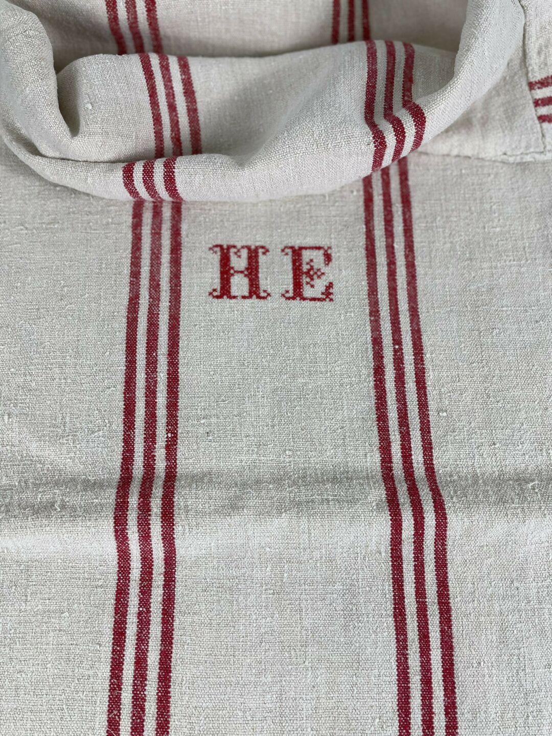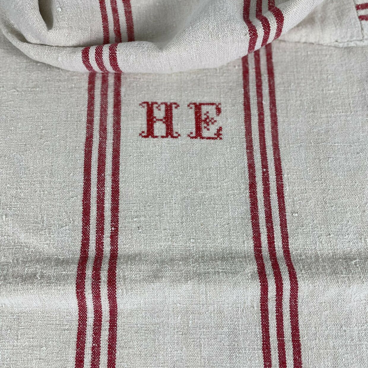 Kézzel szőtt lenvászonból készült zsák, gyönyörű kézzel hímzett monogrammal. Ez a sokoldalú darab ideális kárpitozáshoz, párnákhoz vagy rusztikus lakás dekorációhoz.